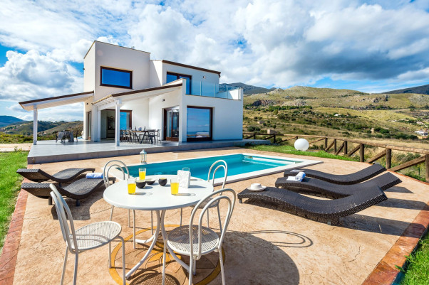 Moderne, komfortable Ferienvilla für 8 Personen mit Privat-Pool in herrlicher Panorama-Lage mit Meerblick nahe Castellamare del Golfo. Großes eingez. Grundstück, Porticato, Panorama-Terassen, Grill, Parkplätze, Internet, Klma-Anlage u.v.m