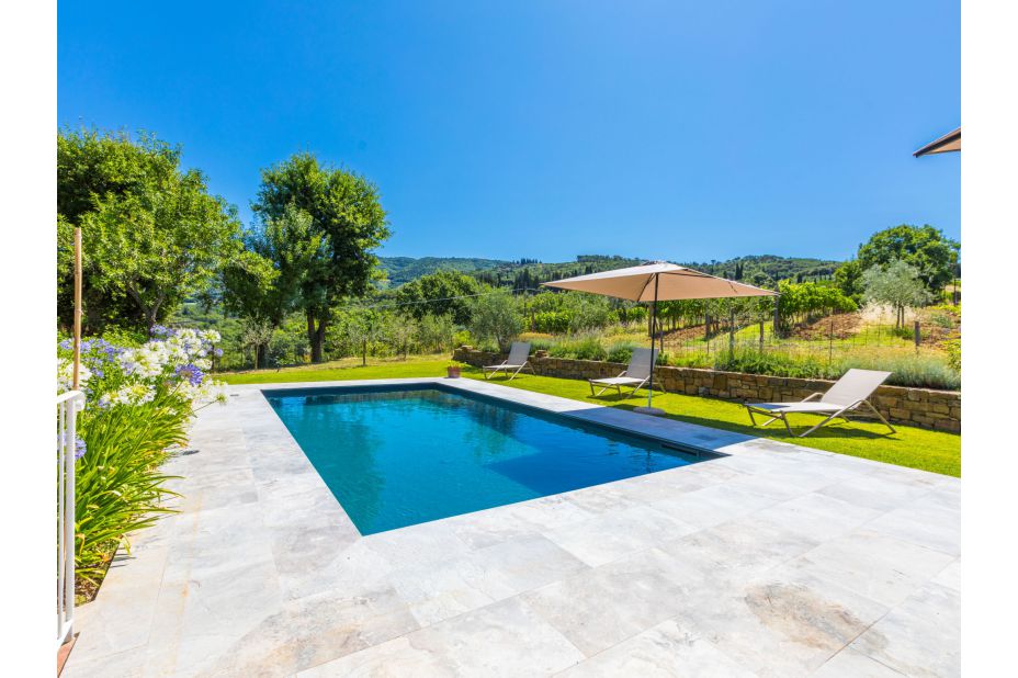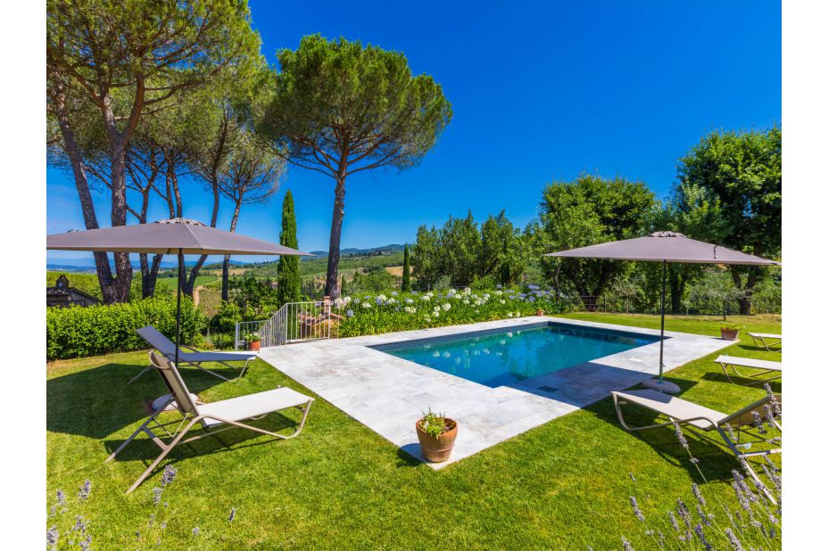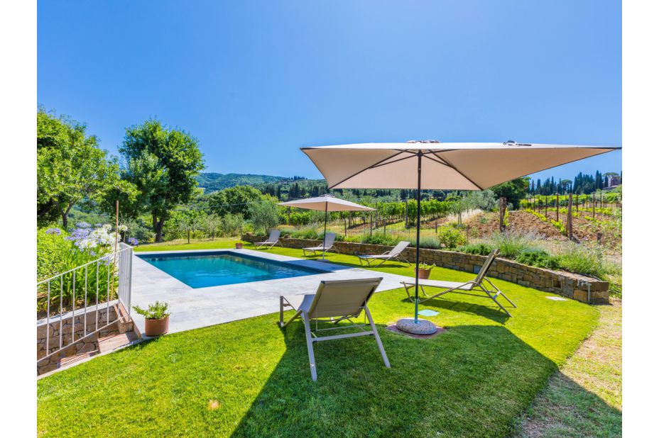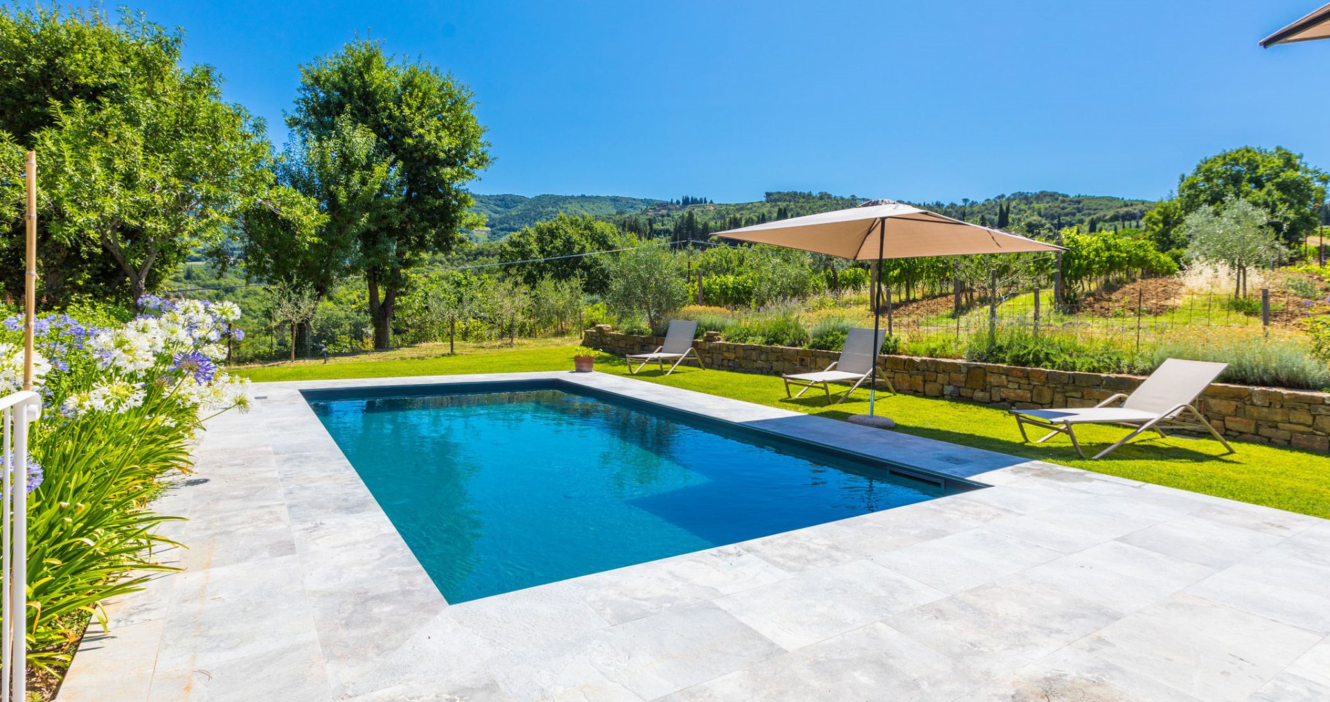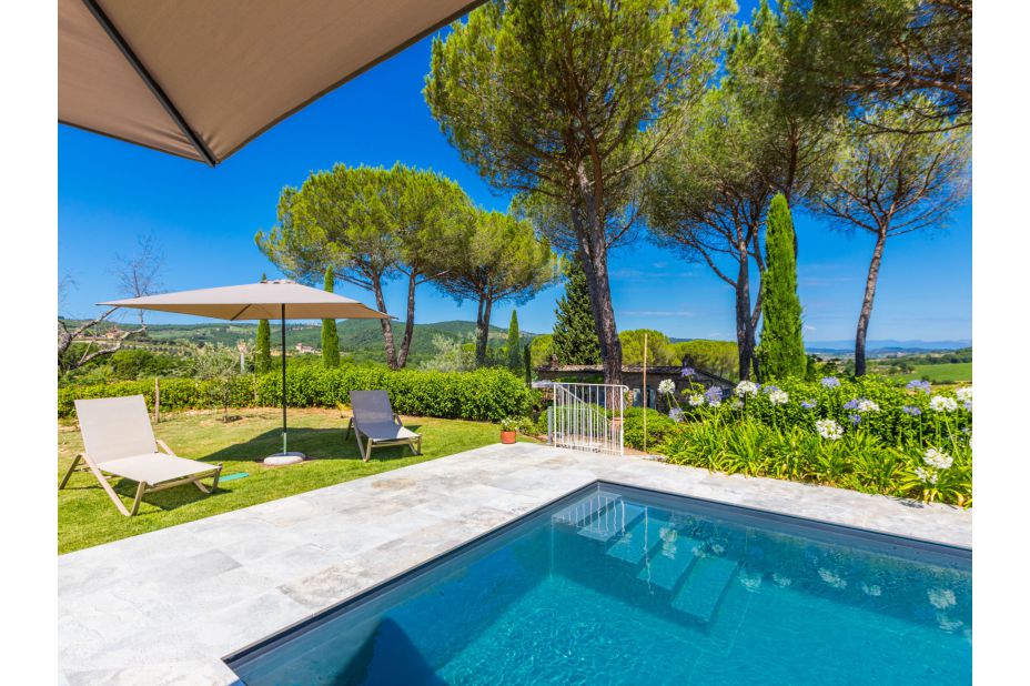 mit Liegen, Sonnenschirme und Aussendusche - und ebenfalls herrlicher Blick in die Chianti-Landschaft.