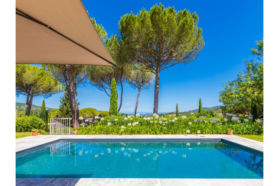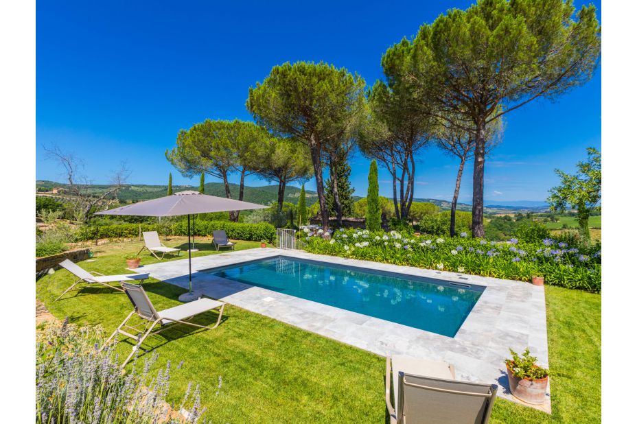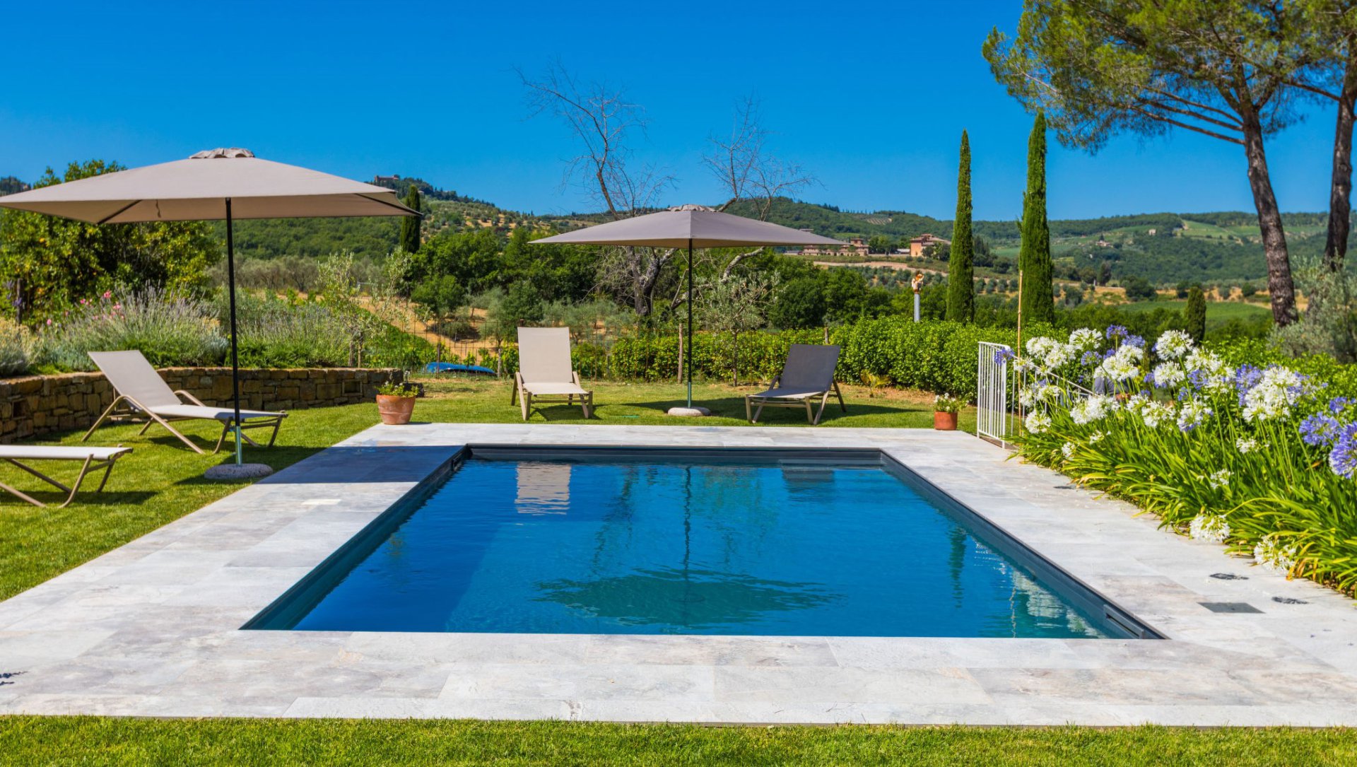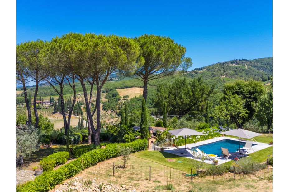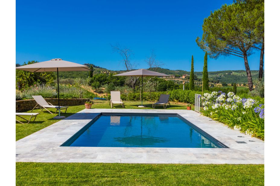 mit Liegen, Sonnenschirme und Aussendusche - und ebenfalls herrlicher Blick in die Chianti-Landschaft.