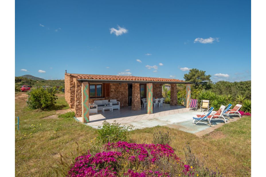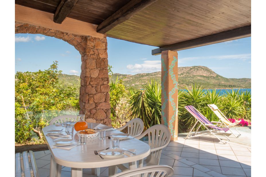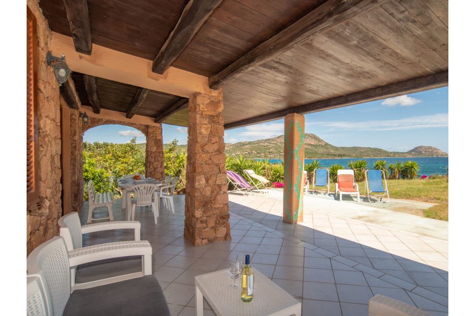 Eine Terrasse mit schattigem Porticato mit Blick aufs Meer, Liegen, eine Außendusche, Parkplatz