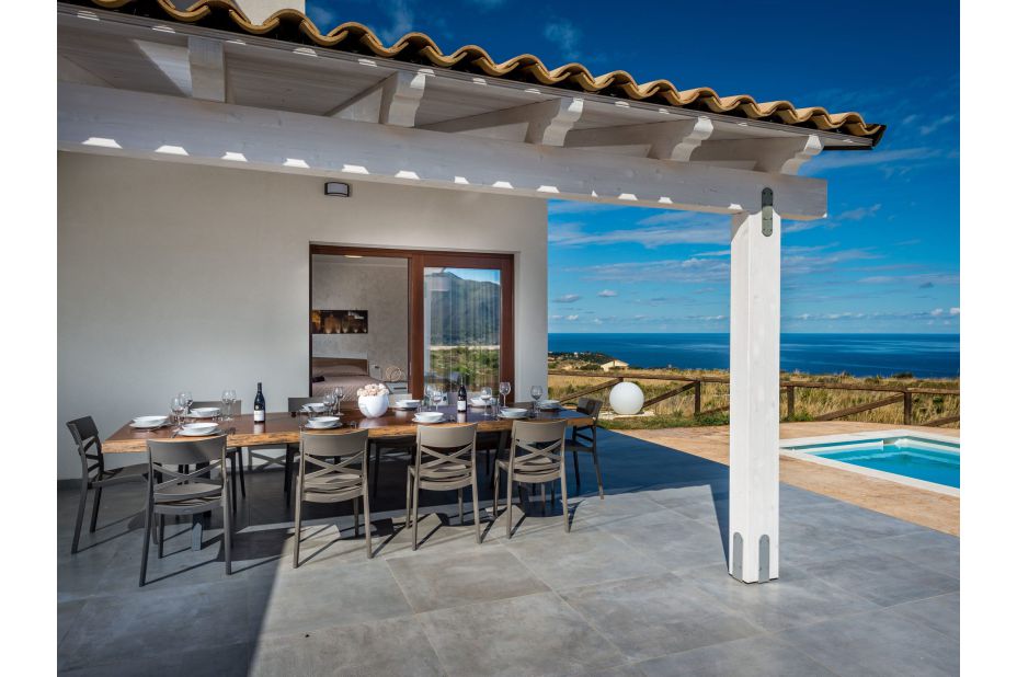Das Haus verfügt über großzügige, möblierte und teilweise überdachte Außenbereiche für Aufenthalte und Mahlzeiten im Freien - und mit herrlichem Panorama und Meerblick.