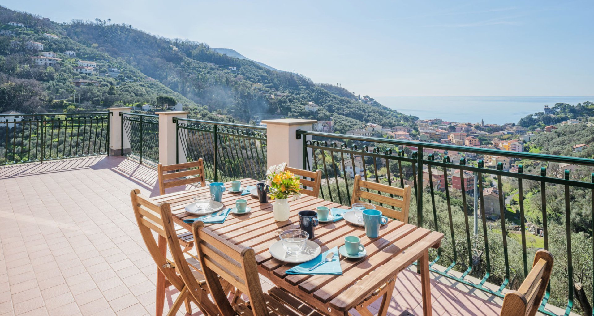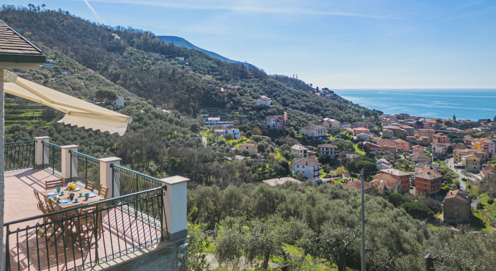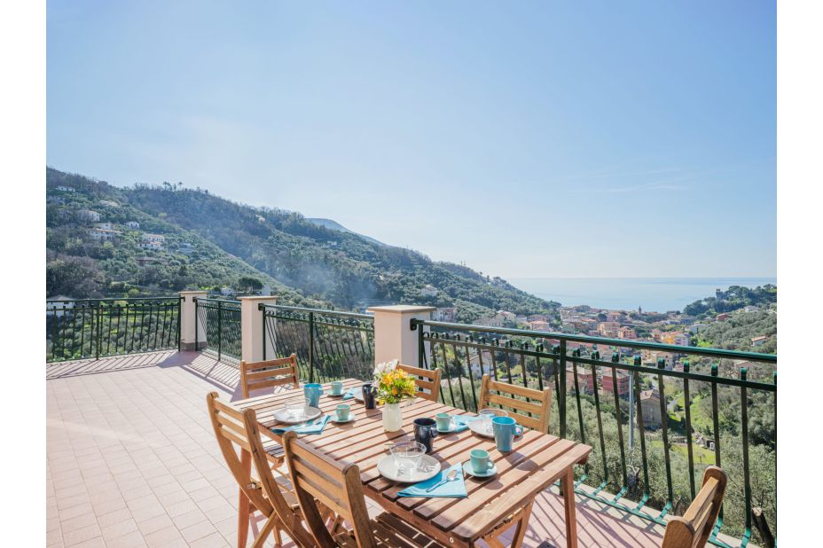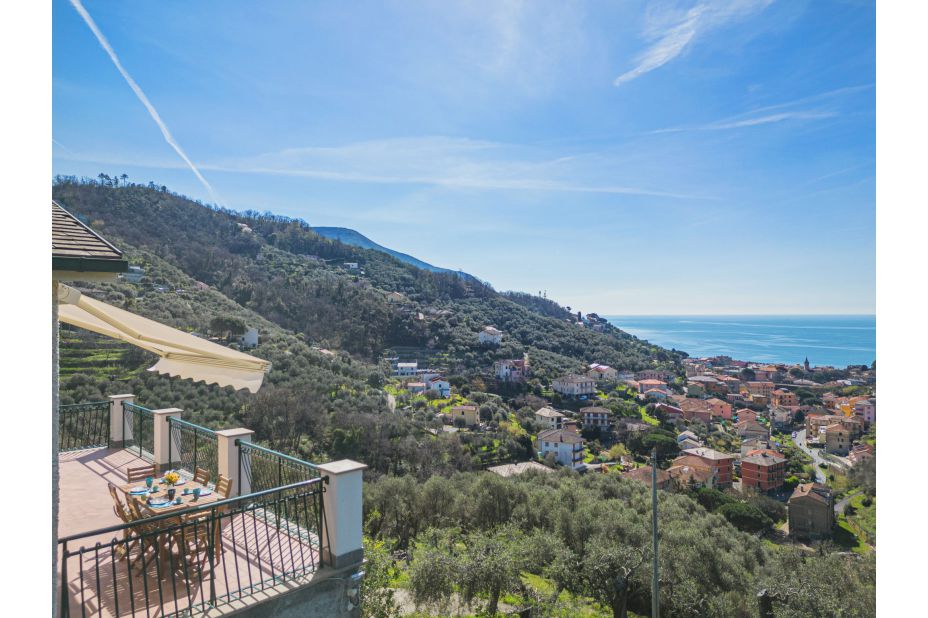 Vom Haus und der möblierten Terrasse genießt man einen herrlichen Blick auf Landschaft und das Meer.