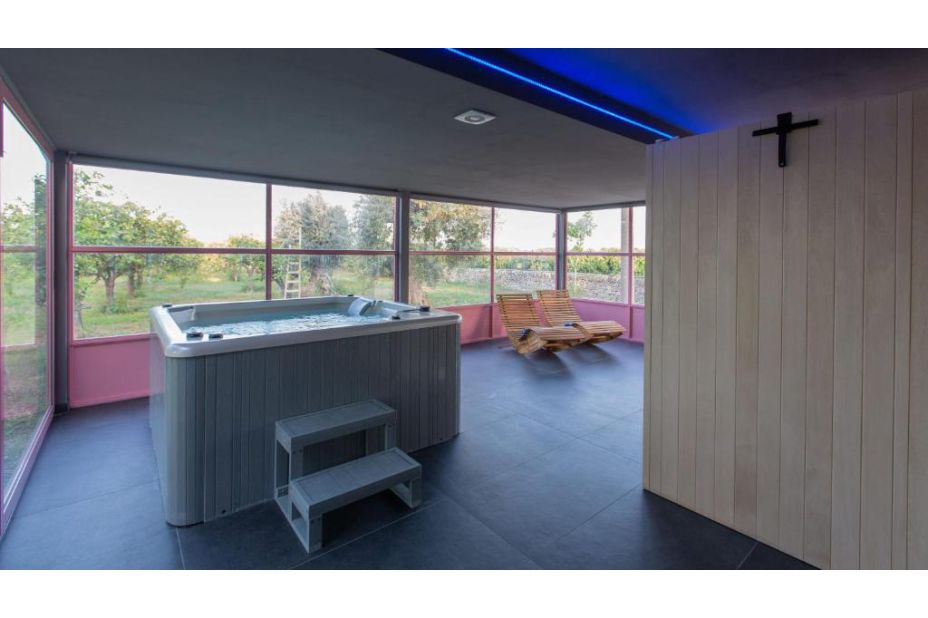 Das Spa mit separatem Eingang besteht aus einem 4-sitzigen beheizten Whirlpool, einer 2-sitzigen finnischen Sauna, einer Erlebnisdusche und einem Ruhebereich mit Chaiselongues.