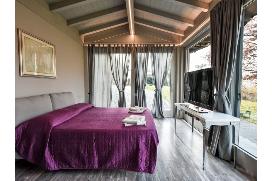 1 abgeschrägtes grosses Zimmer mit Panoramafenster mit 1 Doppelbett (160 cm, Länge 200 cm), TV. Ausgang zum Garten, zum Schwimmbad.