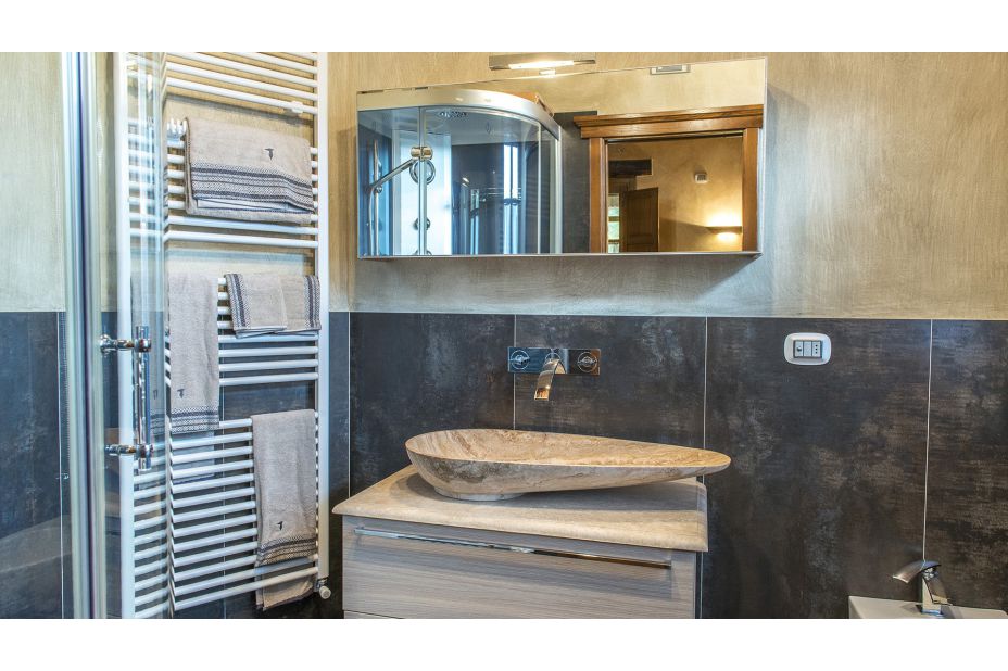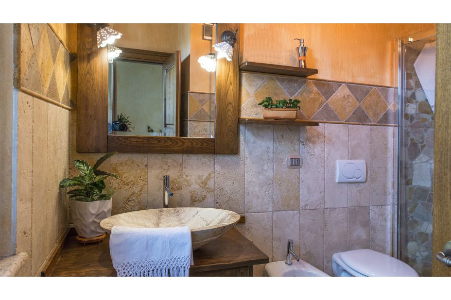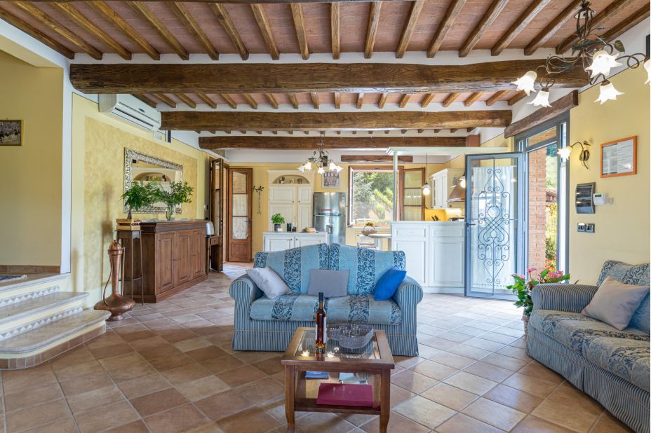 Eines der Doppelzimmer und das Zweibettzimmer verfügen über französische Fenster mit Blick auf den Portikus mit dem Sitzbereich. Eine externe Travertintreppe führt das oberste Stockwerk hinauf, das aus einem großen Wohnzimmer mit Sitz- und Essplatz, einer Küchenzeile und einer großen Panoramaterrasse mit Schiebefenstern, mit Essbereich im Freien, Grill und Holzofen besteht. Das Obergeschoss wird durch den Schlafbereich ergänzt: zwei Doppelzimmer mit jeweils eigenem Bad (eines mit Dusche und eines mit Hydromassage-Dusche und Hydromassage-Wanne) und ein Zweibettzimmer (mit zusammengefügten Betten), die von einem Badezimmer mit Hydromassage-Dusche und Farbtherapie serviert werden.