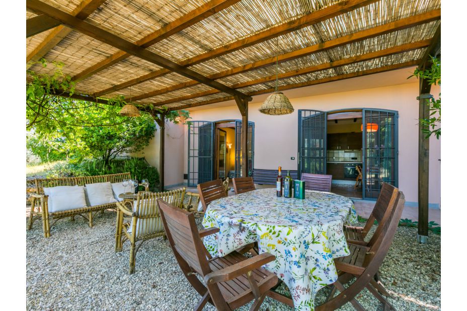 Das Ferienhaus ist von einer ca. 180 m2 großen Panorama-Terrasse mit Essplatz, und teils unter schilfgedeckter Pergola mit Liegen, umgeben.