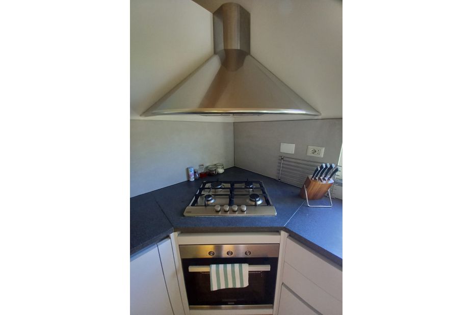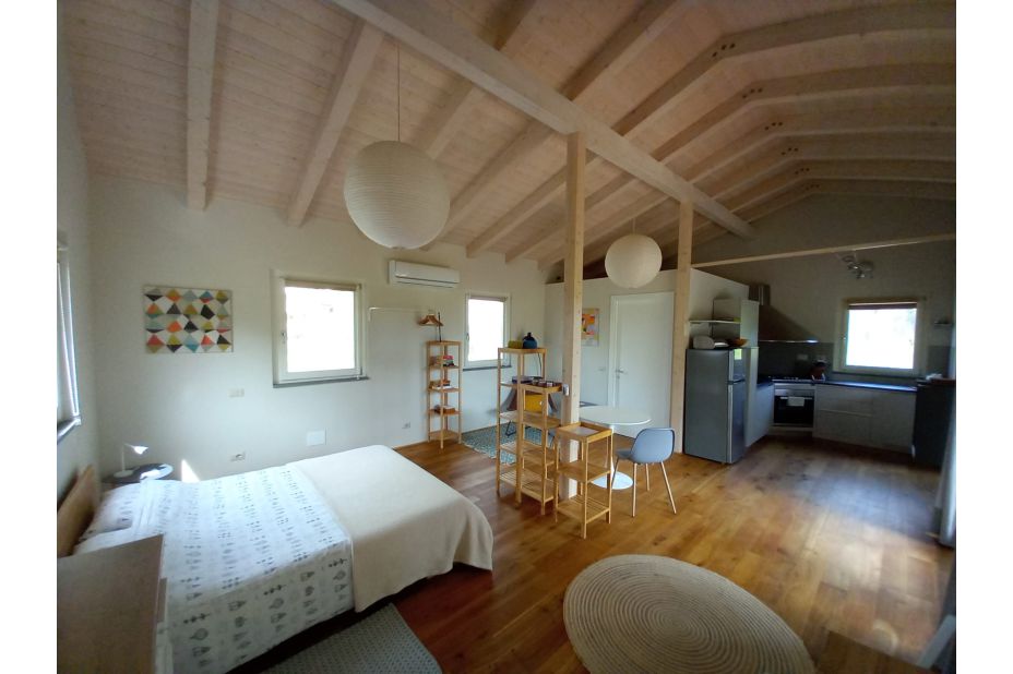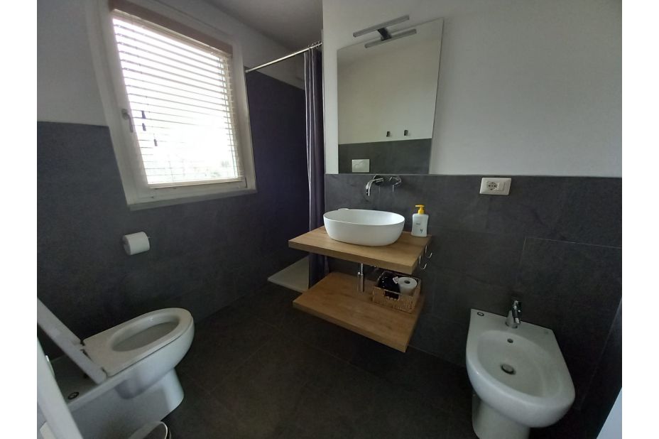 Es gibt ein Doppelbett (160 x 200 cm), eine voll ausgestattete Küche, ein Badezimmer mit WC, Waschbecken, Bidet und ebenerdiger Dusche,