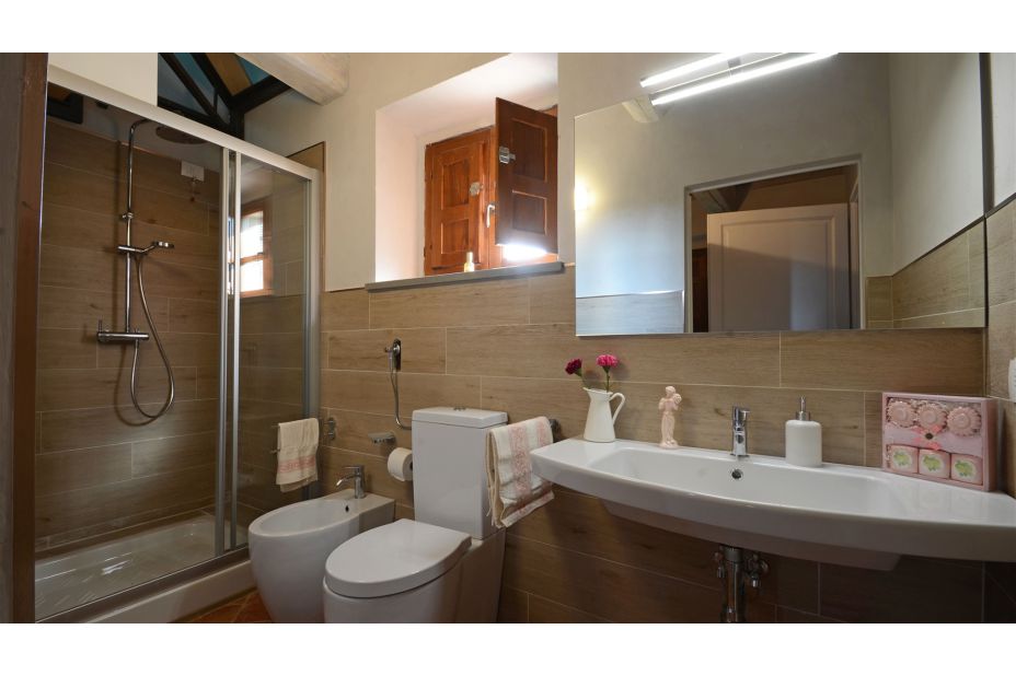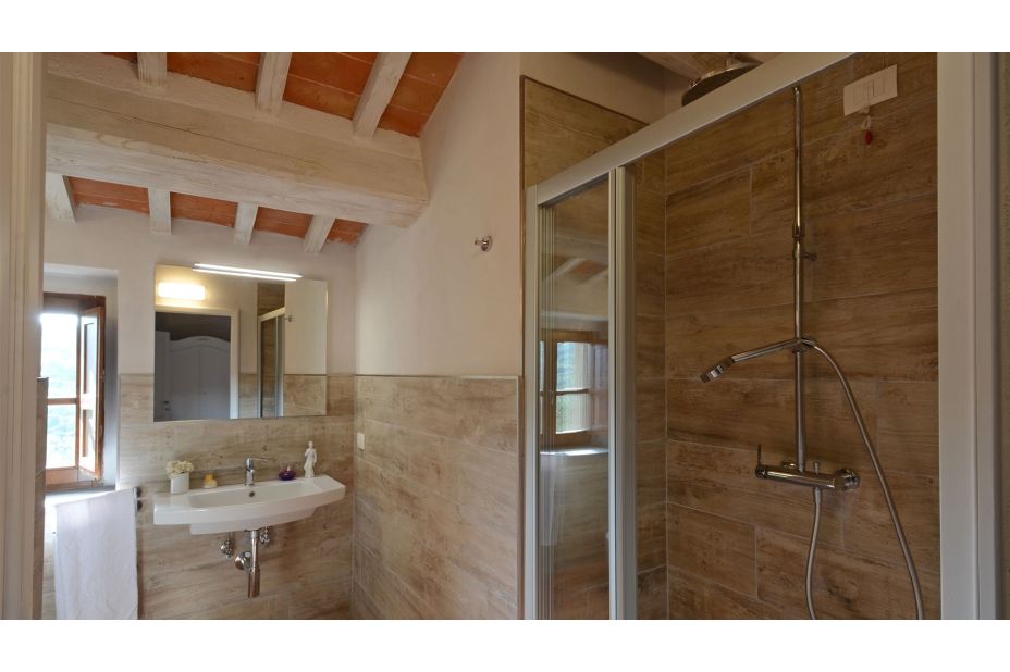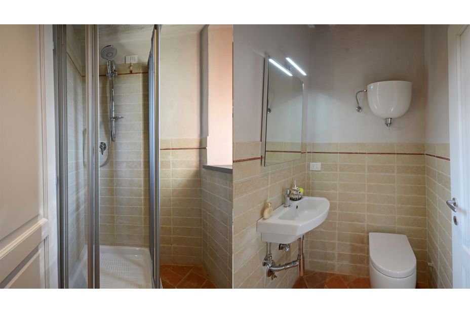 auf der zweiten Ebene gibt es ein Doppelzimmer mit eigenem Bad mit Dusche und ein weiteres Doppelzimmer mit einem Bad.