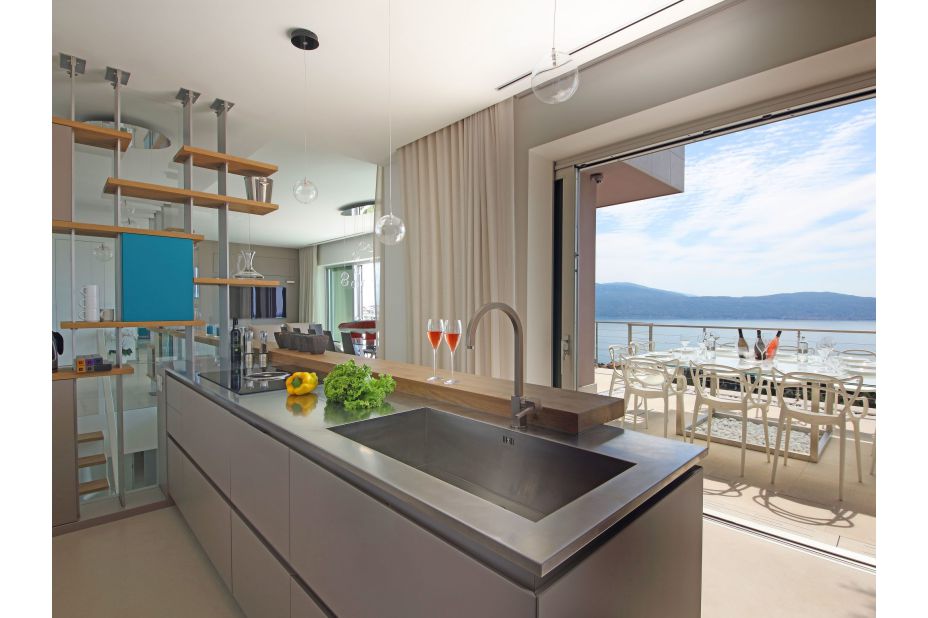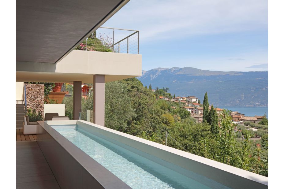 Der Panorama-Pool beefindet sich auf einerTerrasse mit unvegleichlichem Blick auf den See. Liegen und Sonnenschirme sowie