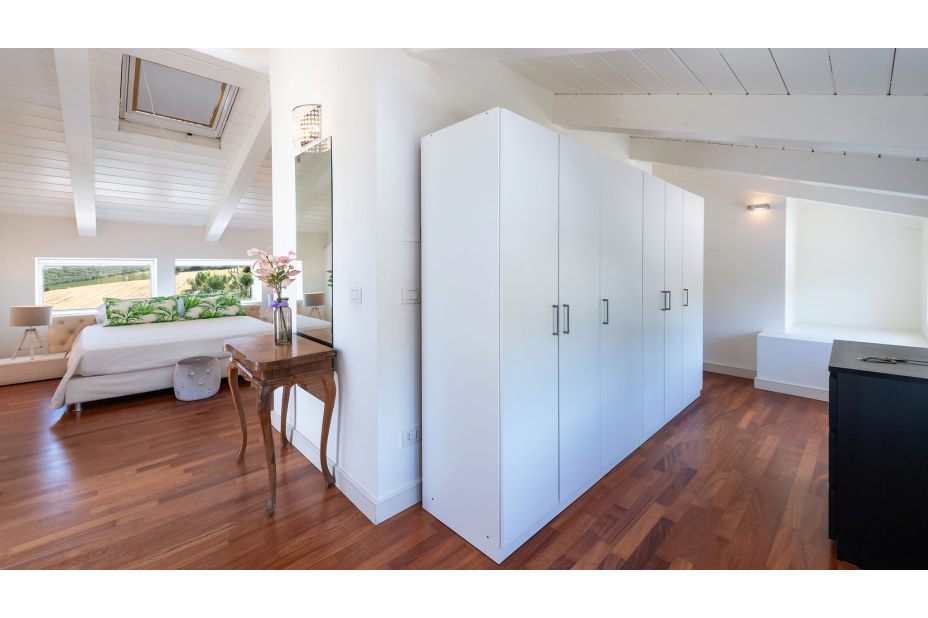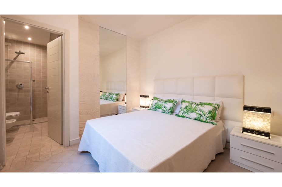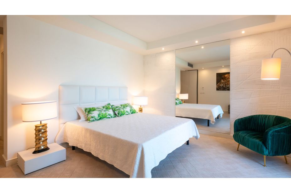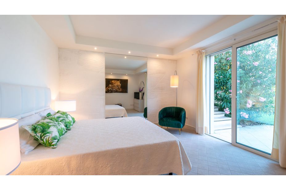 ZWISCHENEBENE: Erreichbar über eine Innentreppe, auf der gleichen Ebene wie der Pool; Wohnbereich mit Essbereich; Service-Bad (ohne Bidet); vier Schlafzimmer: ein Doppelzimmer mit begehbarem Kleiderschrank; zwei Doppelzimmer mit eigenem Bad mit Badewanne und Dusche, direkter Zugang zum Garten und dem Pool; ein Doppelzimmer mit eigenem Bad mit Dusche. Waschküche mit externem Zugang.