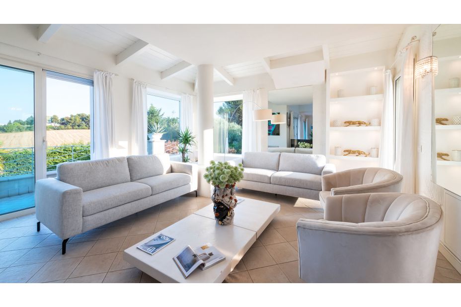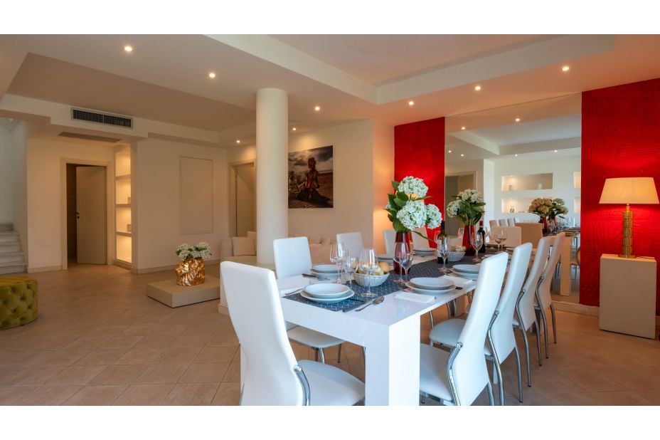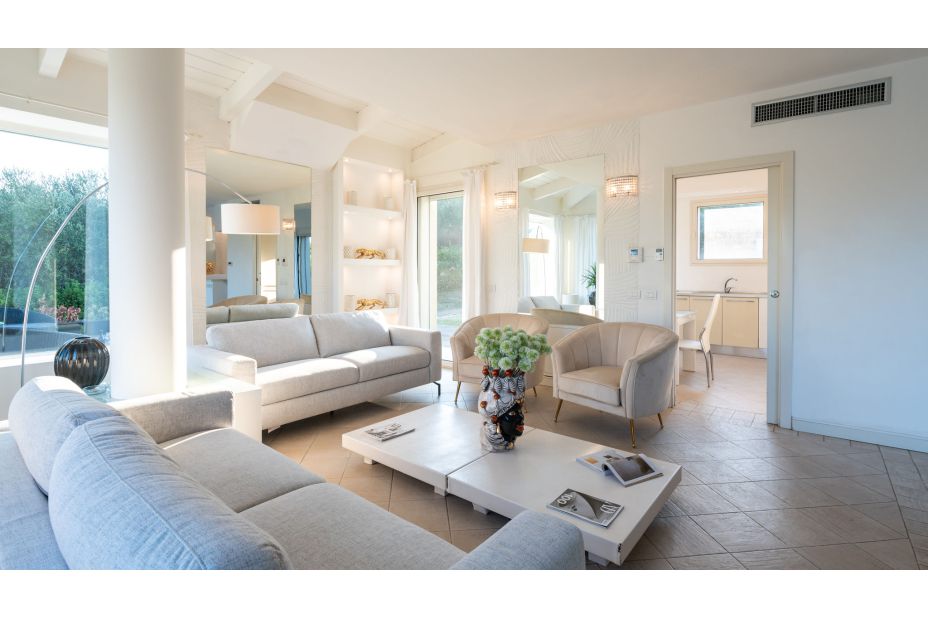 ERDGESCHOSS - Haupteingang, der zu einem großen offenen Raum mit einem Doppelwohnbereich, Sofas, Sesseln, Smart-TVs und großen Fenstern führt (teilweise Schiebefenster), mit direktem Zugang zur Panoramaterrasse;