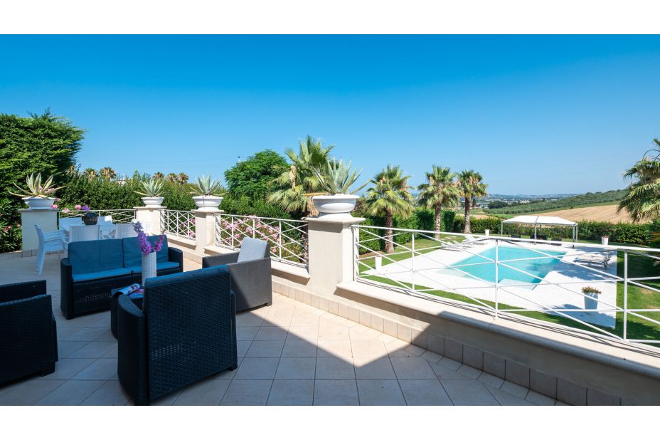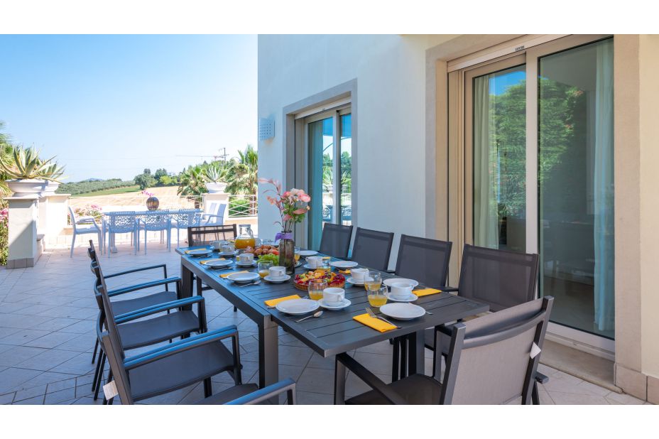 Eine große Panoramaterrasse umgibt das Erdgeschoss, mit Blick auf das Meer und den Pool; Essbereich; Holzsolarium mit Sesseln; beheizter Whirlpool (33 ° C) für vier Personen.