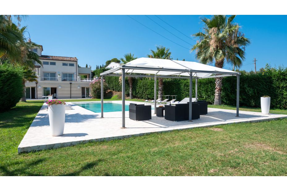 Es befindet sich auf der gleichen Ebene wie das Untergeschoss und kann auch durch Glastüren vom Essbereich und den beiden Schlafzimmern erreicht werden. Rechteckige Form; Abmessungen 15 x 4,5 m mit einer konstanten Tiefe von 1,30 m; Chlorreinigung; verspiegelte bichromatische palladische Beschichtung; große Eingangsstufen; LED-Atmosphärenbeleuchtung; große Poolterrasse mit passender Abdeckung, Sonnenliegen, Pavillon mit Segel, das einen Loungebereich schattiert.