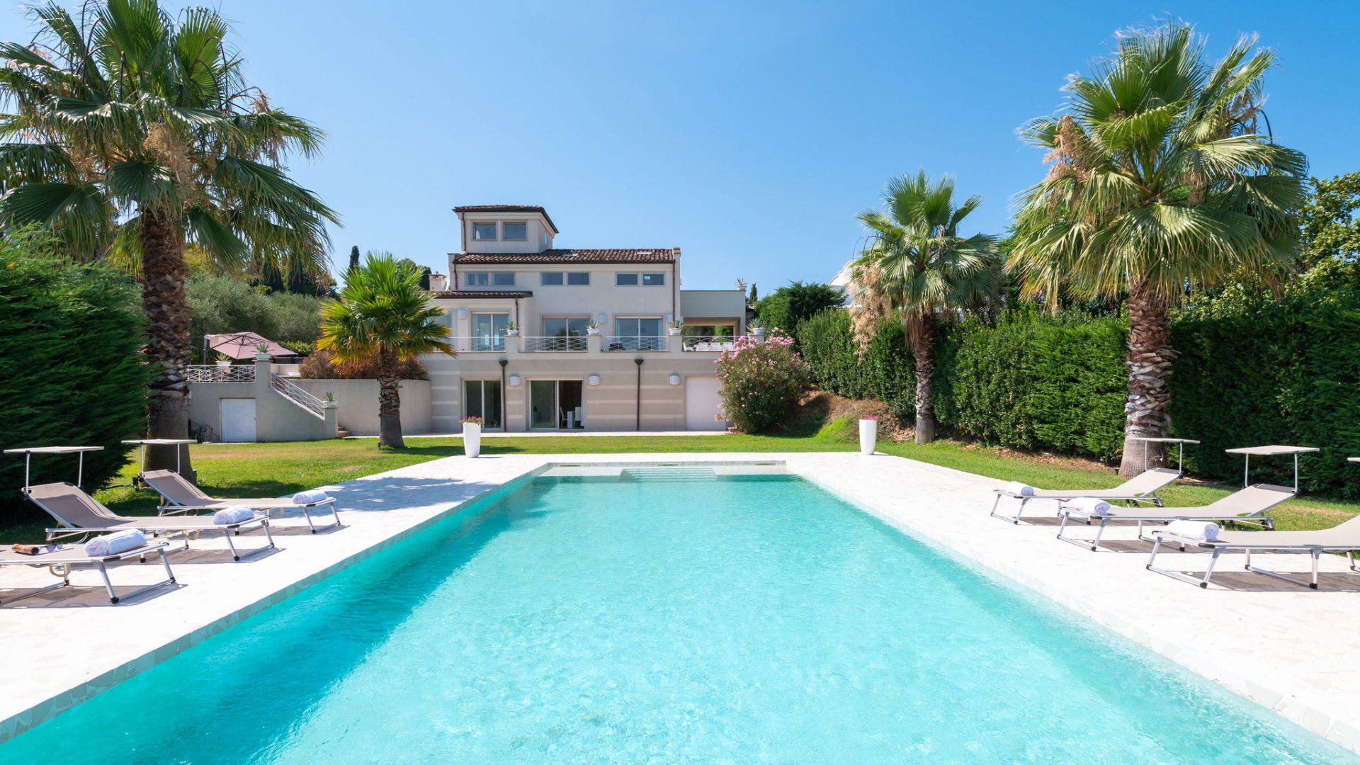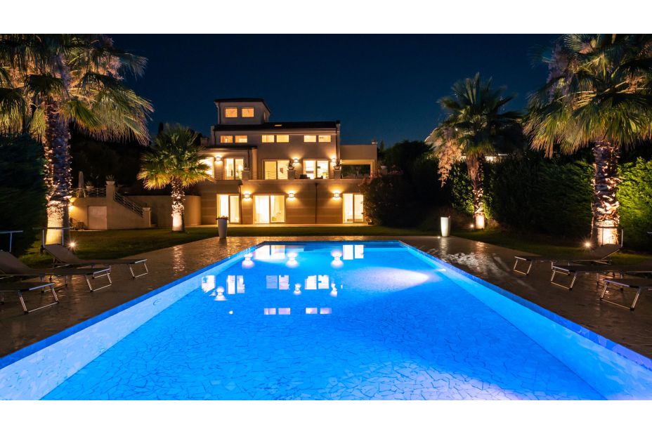 Der Pool befindet sich auf der Rückseite der Villa, erreichbar über zwei Treppen von der Panoramaterrasse.