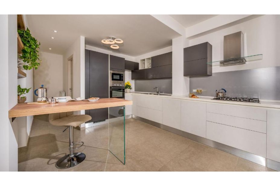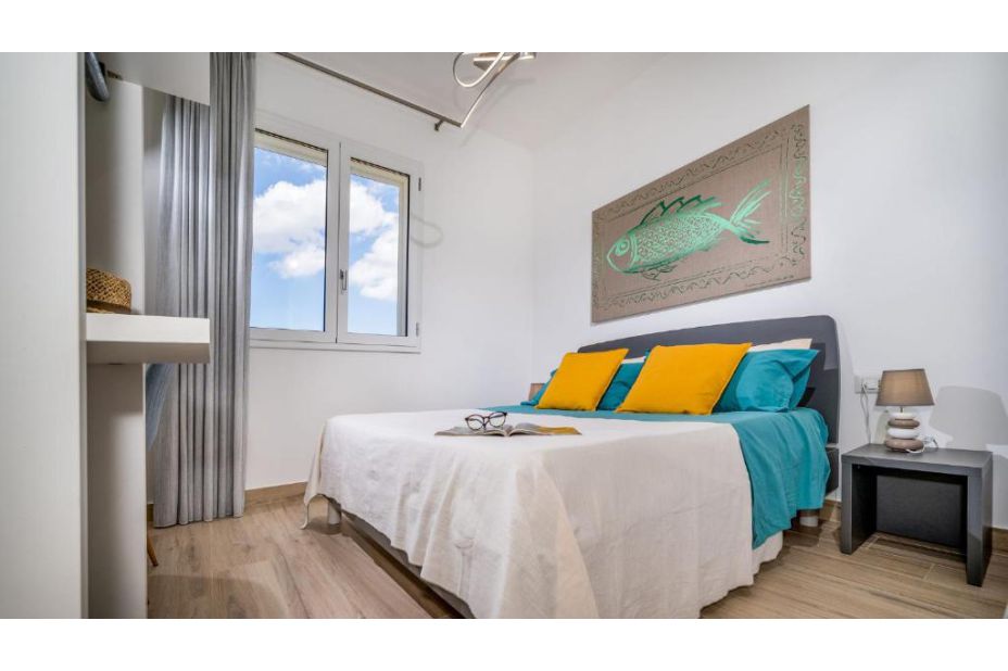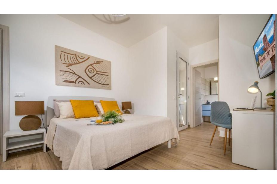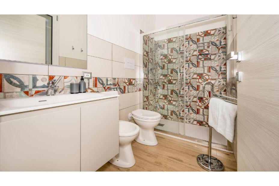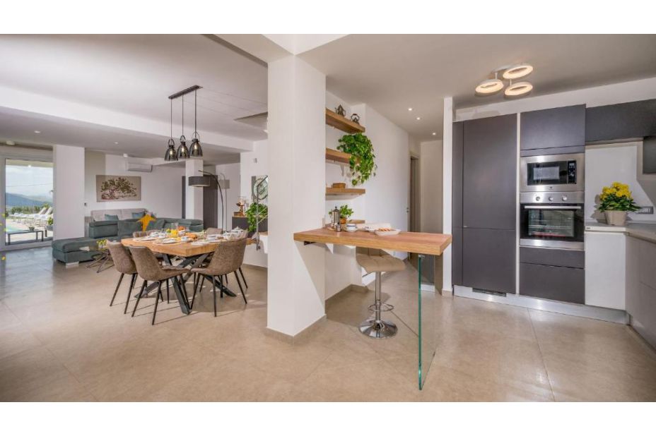 Im Erdgeschoss, von einer großen Glasschiebetür, können Sie das große Wohnzimmer mit Sofas (einschließlich einem Schlafsofa) und TV-Bereich, Essbereich und moderne Küche erreichen. Das EG ist mit einem Badezimmer mit Dusche ausgestattet. Vom Wohnzimmer führt eine Treppe ins Obergeschoss, in dem sich der Schlafbereich befindet, bestehend aus einem Schlafzimmer mit eigenem Bad mit Dusche, zwei Doppelzimmern und einem Badezimmer mit Dusche.
