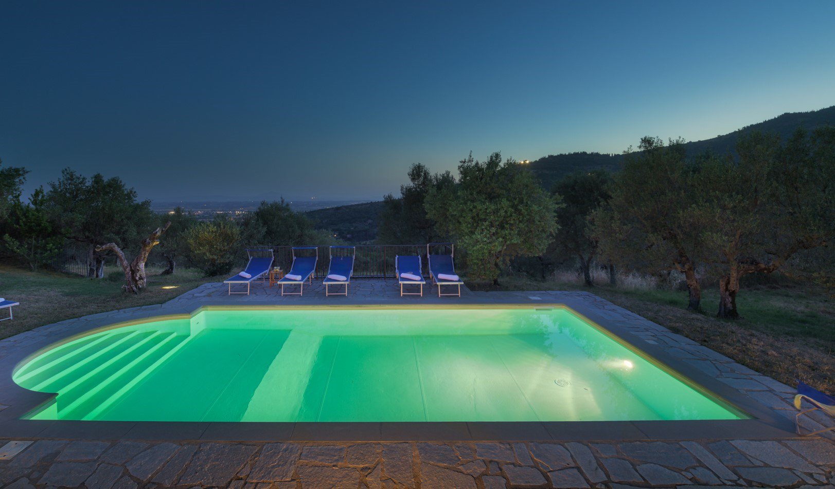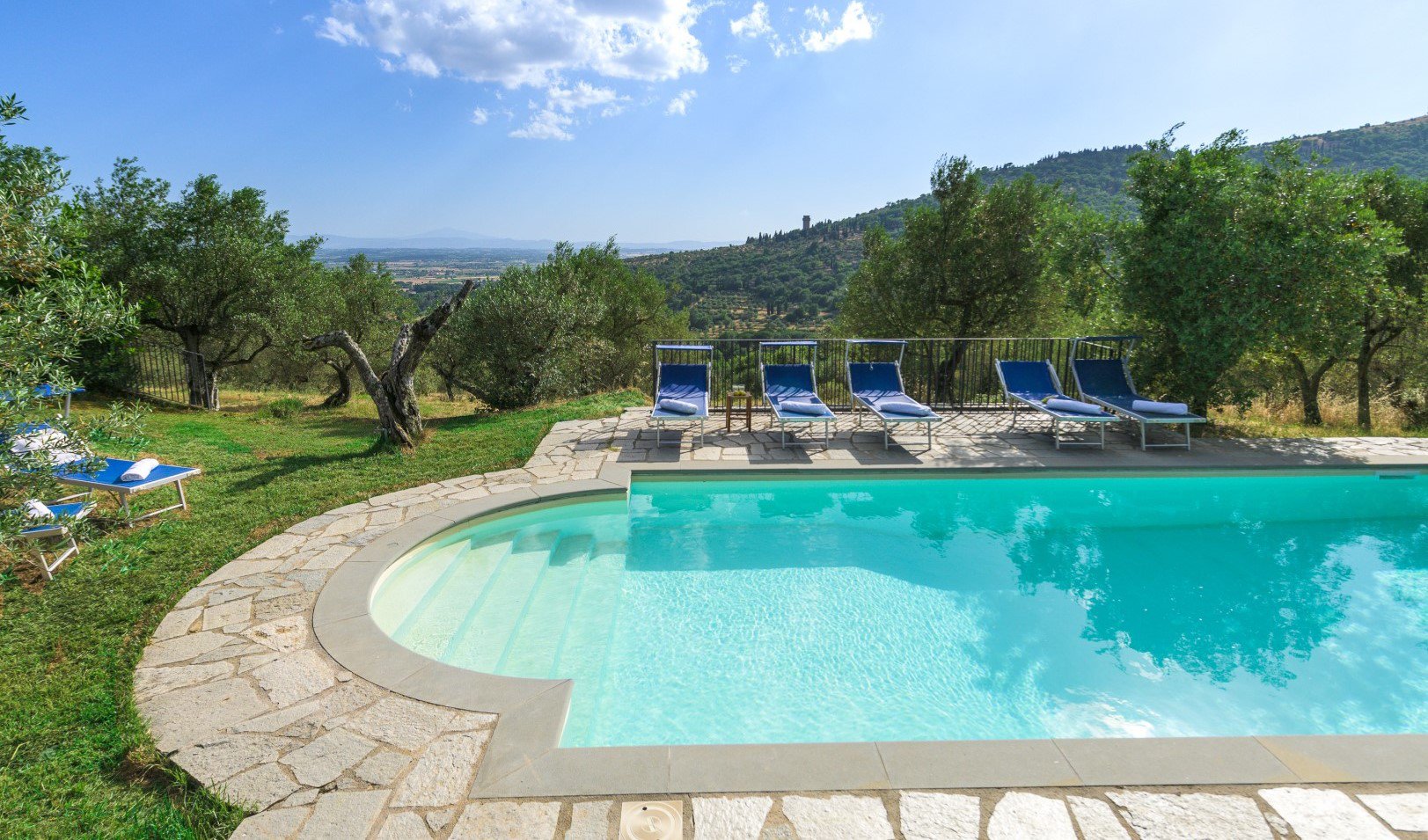 Wenige Meter vom Haus entfernt, befindet sich der herrliche Pool mit römische Einstiegstreppe, 9,30 m x 4 m und 1,2 bis 1,5 m tief. Das Schwimmbad ist mit Naturstein umrandet und befindet sich inmitten eines großen Gartengrundstücks.
