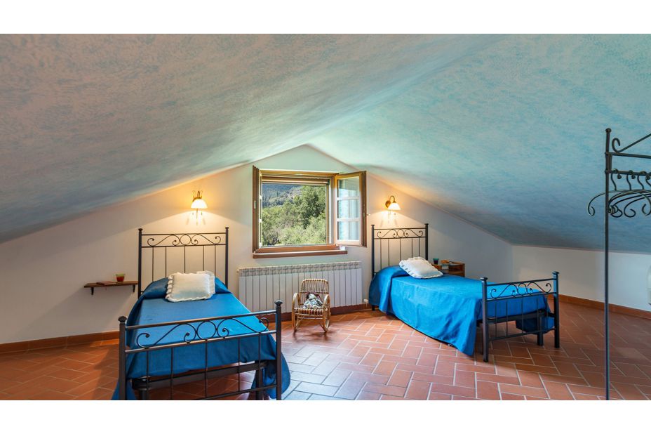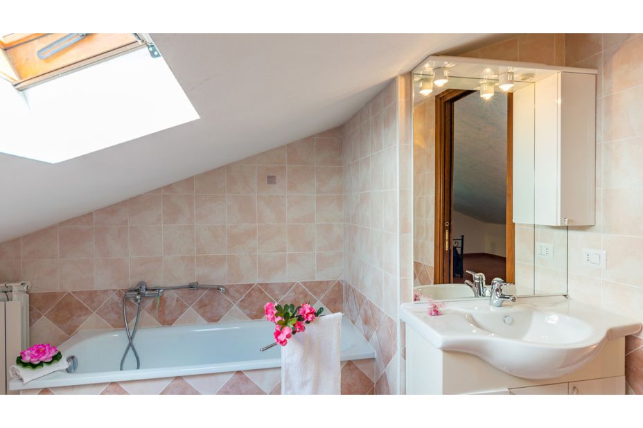 Vom Eingang, der zum Schlafbereich führt, führt eine sehr steile Holztreppe (nicht für ältere und kleine Kinder geeignet) zum Dachboden, wo es 2 Einzelbetten und ein Badezimmer mit Badewanne gibt.