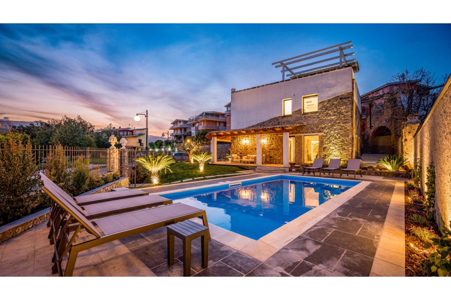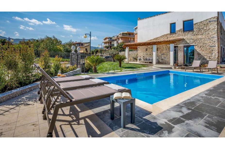 Der rechteckige Pool misst 8 x 4 m und hat eine konstante Tiefe von 1,20 m. begehbar über Treppe mit wenigen Stufen und ist wird mit Chlor desinfiziert. Der Pool wird von einem Steinzeugboden begrenzt, auf dem Sonnenliegen und Sonnenschirme platziert sind; über den Steinzeugboden hinaus eine Wiese mit blühenden Rändern.