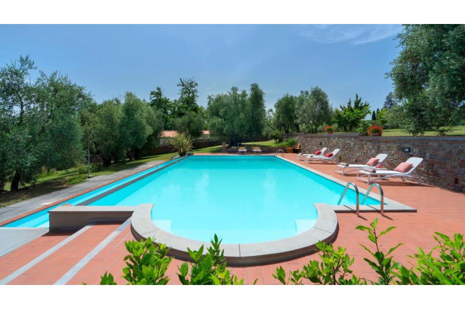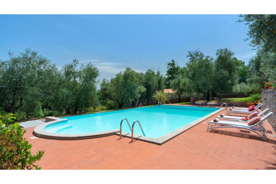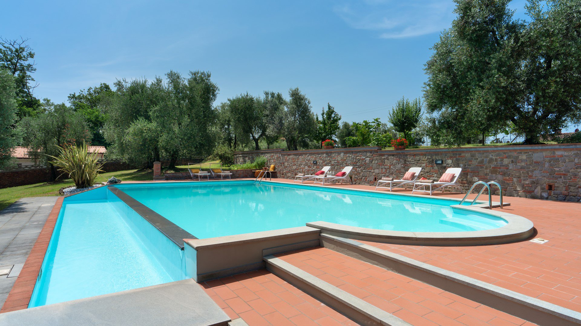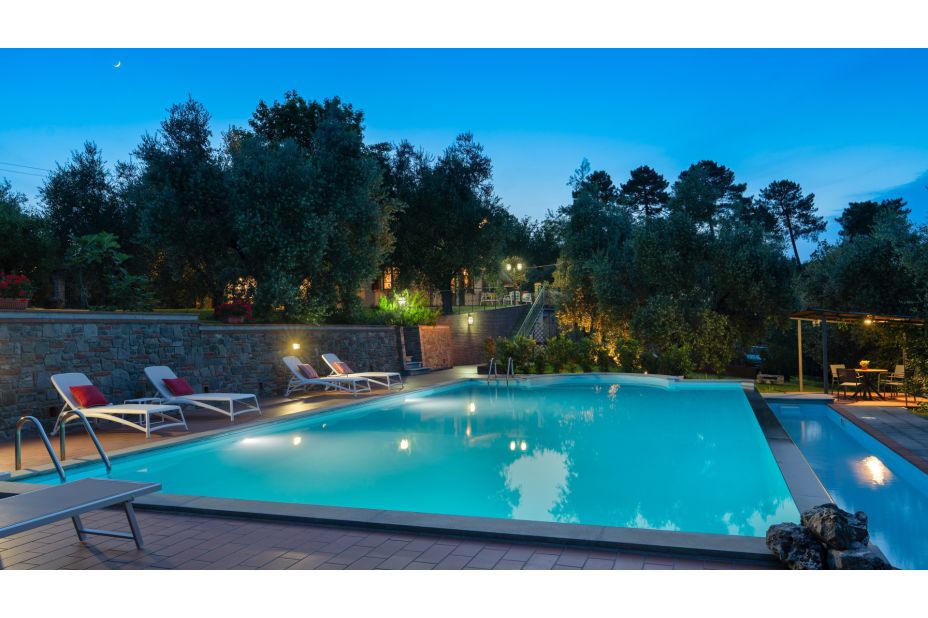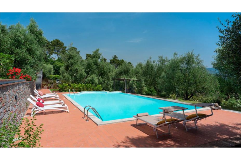 Der Pool befindet sich etwa 40 Meter von der Villa entfernt, erreichbar über zwei kurze Treppen. Rechteckig in Form, es misst 12 x 6 m mit einer Tiefe von 1,20 bis 2,20 m; es ist mit hellblauem PVC bedeckt und mit Hydromassage-Bereich und römischer Treppe für den Zugang ausgestattet.