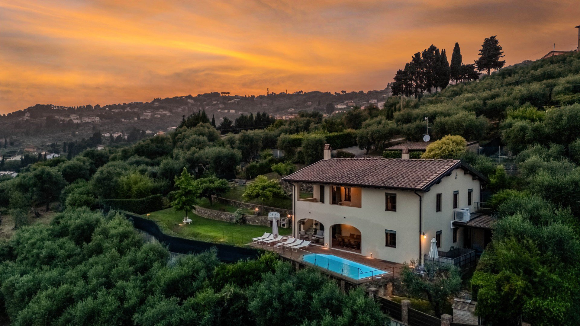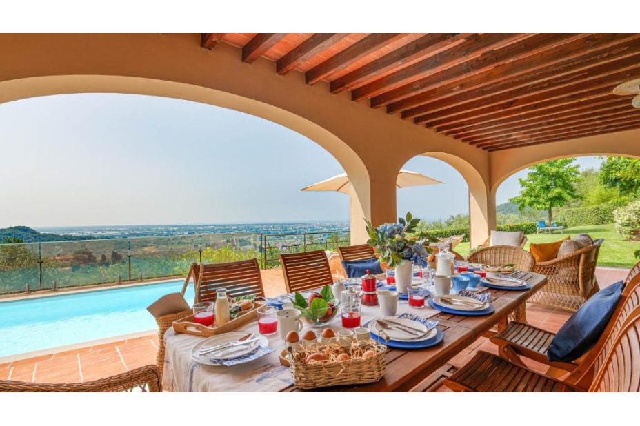 Der Pool befindet sich auf der gleichen Ebene wie das Erdgeschoss der Villa, ca. 2 m entfernt und bietet einen Panoramablick auf die Stadt Viareggio mit seinem blauen Meer.