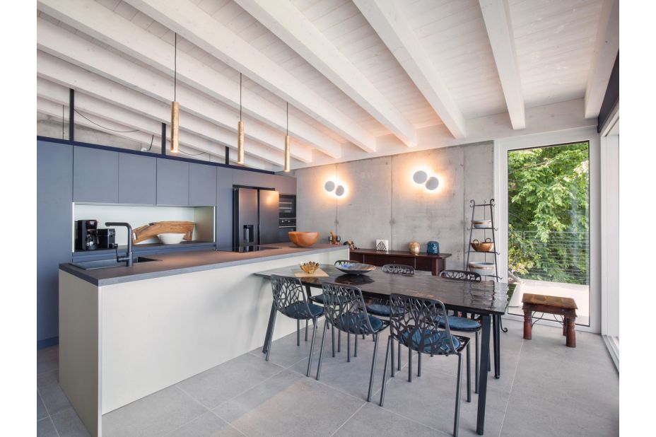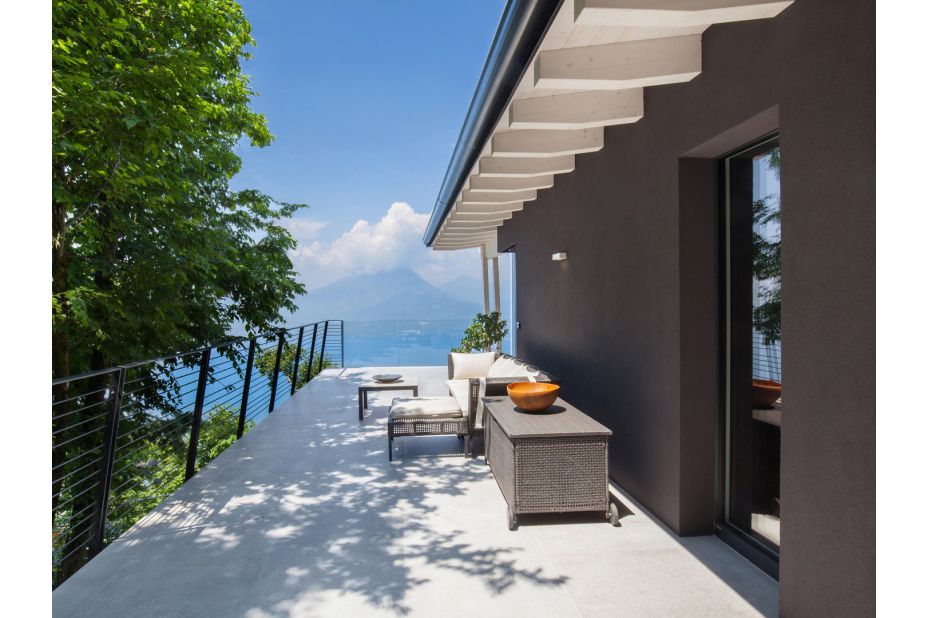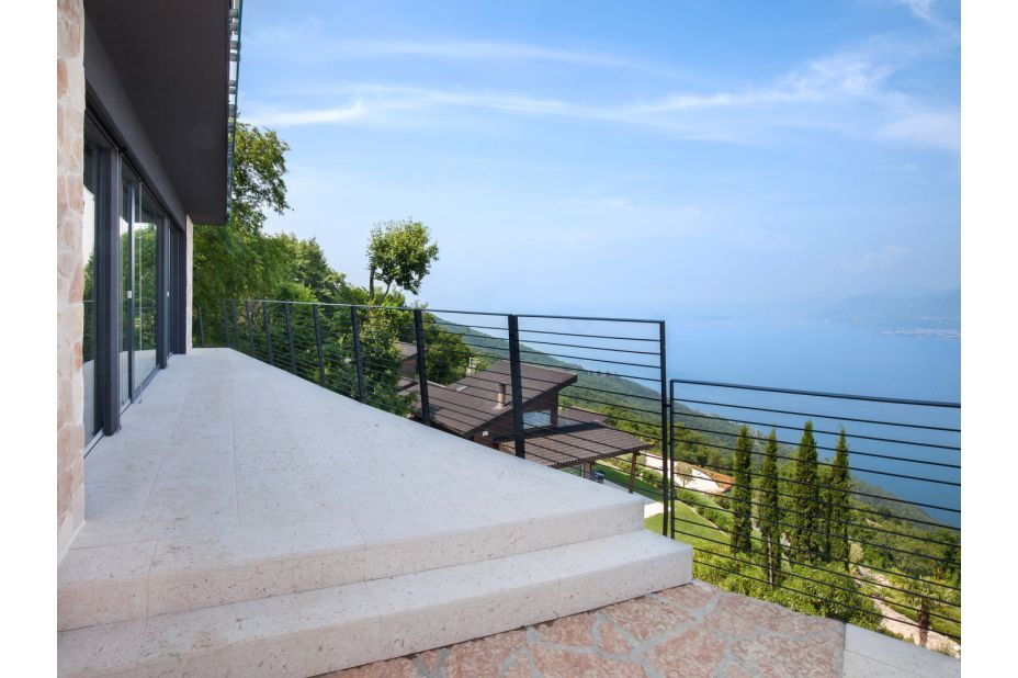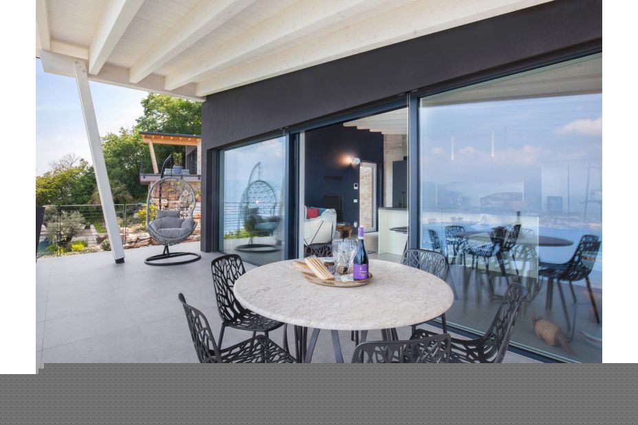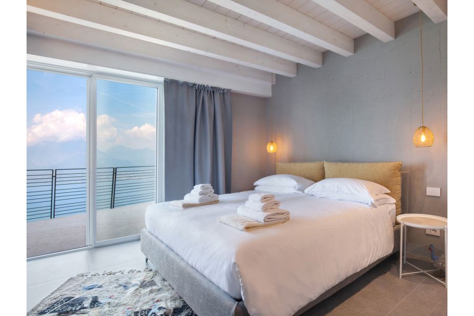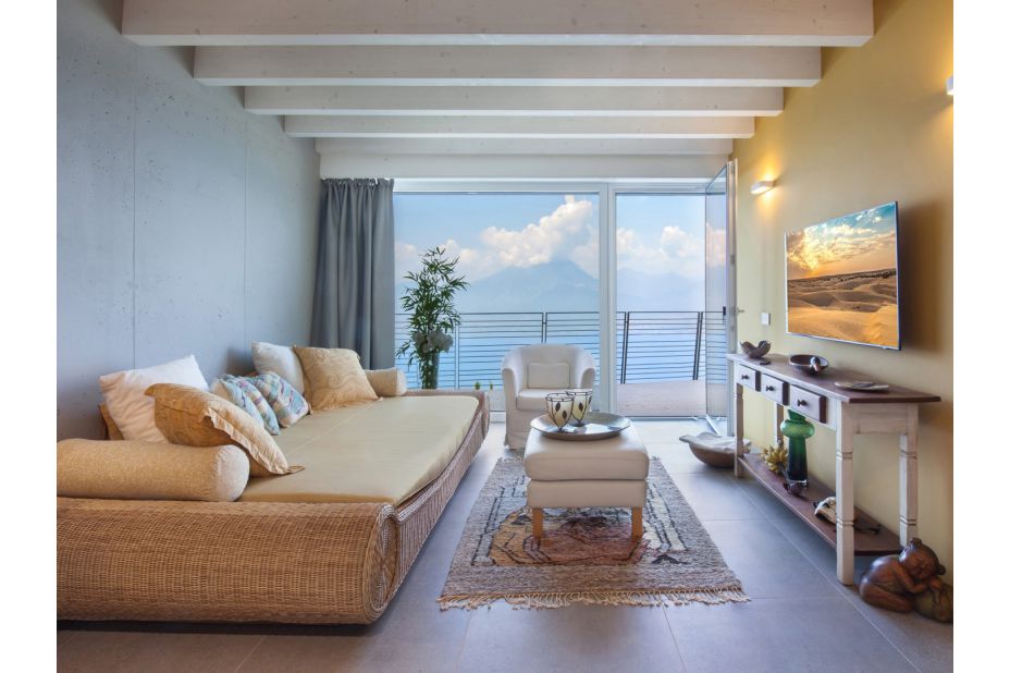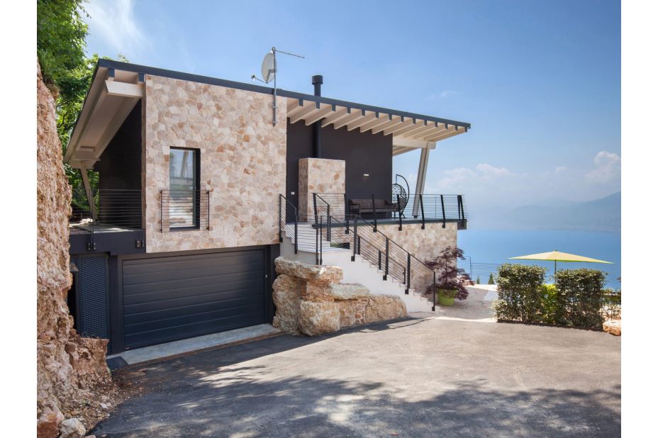 Die Villa befindet sich auf zwei Etagen und bietet einen atemberaubenden Blick auf den See und die Berge.