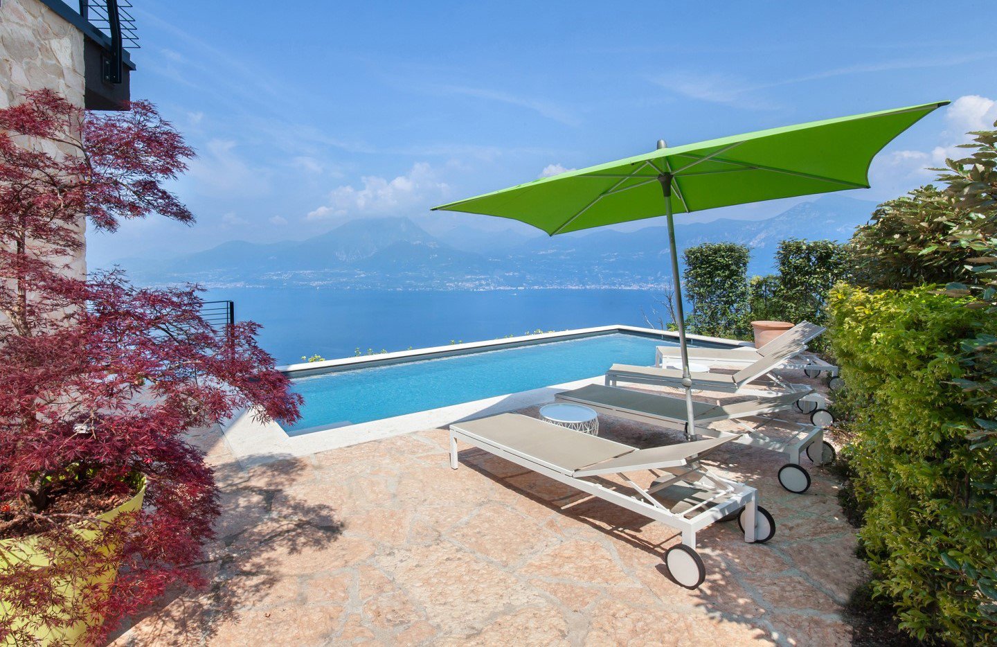Der private Pool, integriert in die Terrasse, bietet einen weiten Blick auf den See und ist mit Liegestühlen für maximalen Komfort ausgestattet. Der Pool hat eine rechteckige Form mit den Abmessungen 3 x 8 m und eine konstante Tiefe von 1,40 m.