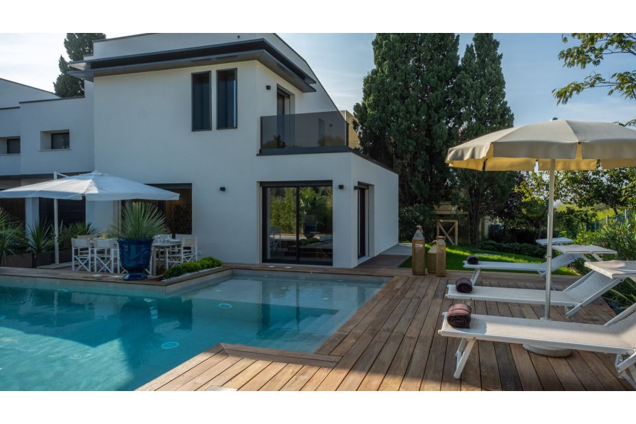 Der Pool befindet sich vor der Villa, im Vergleich zum Garten auf einer Holzplattform leicht erhöht. Er hat eine unregelmäßige Form, die etwa 45 Quadratmeter misst und die Tiefe variiert von 0,30 bis 1,20 m. Er ist mit Feinsteinzeug beschichtet und verfügt über ein Chlorreinigungssystem mit Sandfilter.