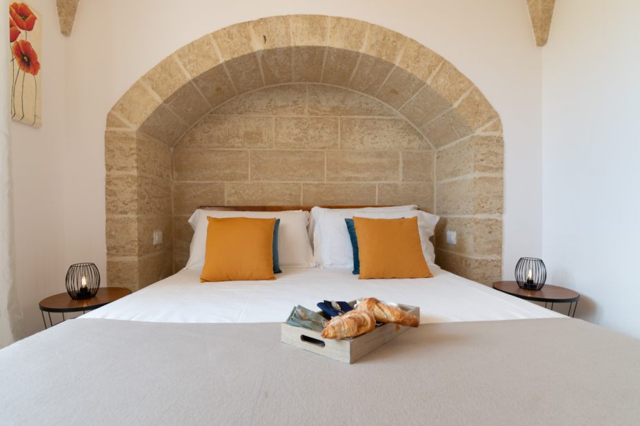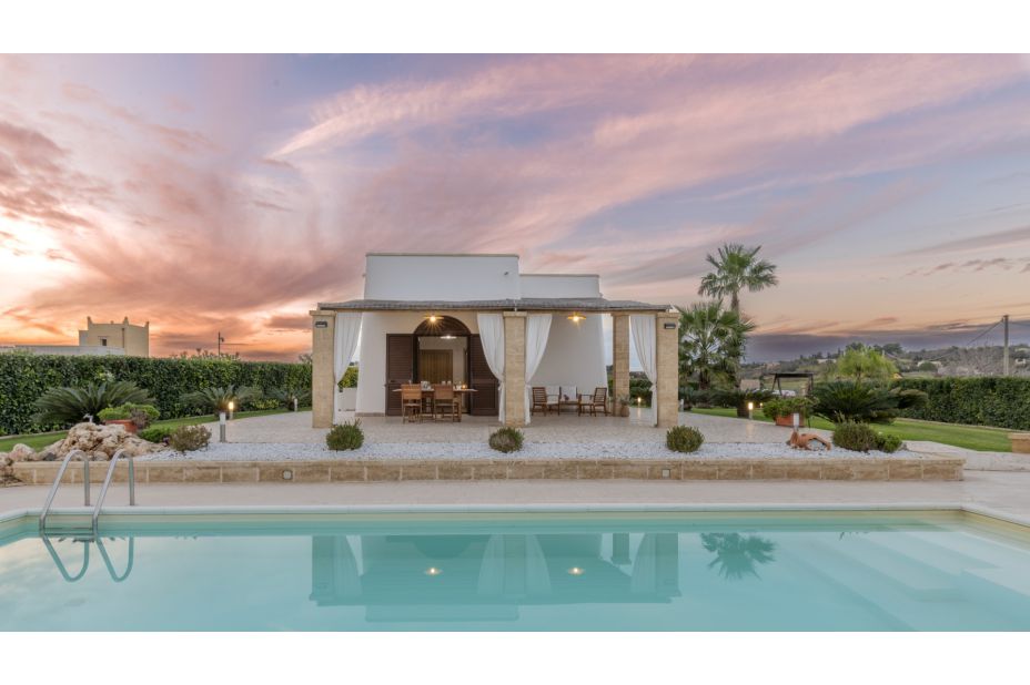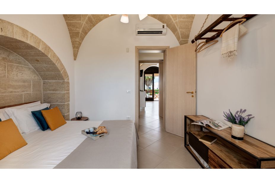 Das Solarium, gepflastert in Trani-Stein, ist mit Sonnenliegen und Außendusche mit kaltem Wasser ausgestattet.