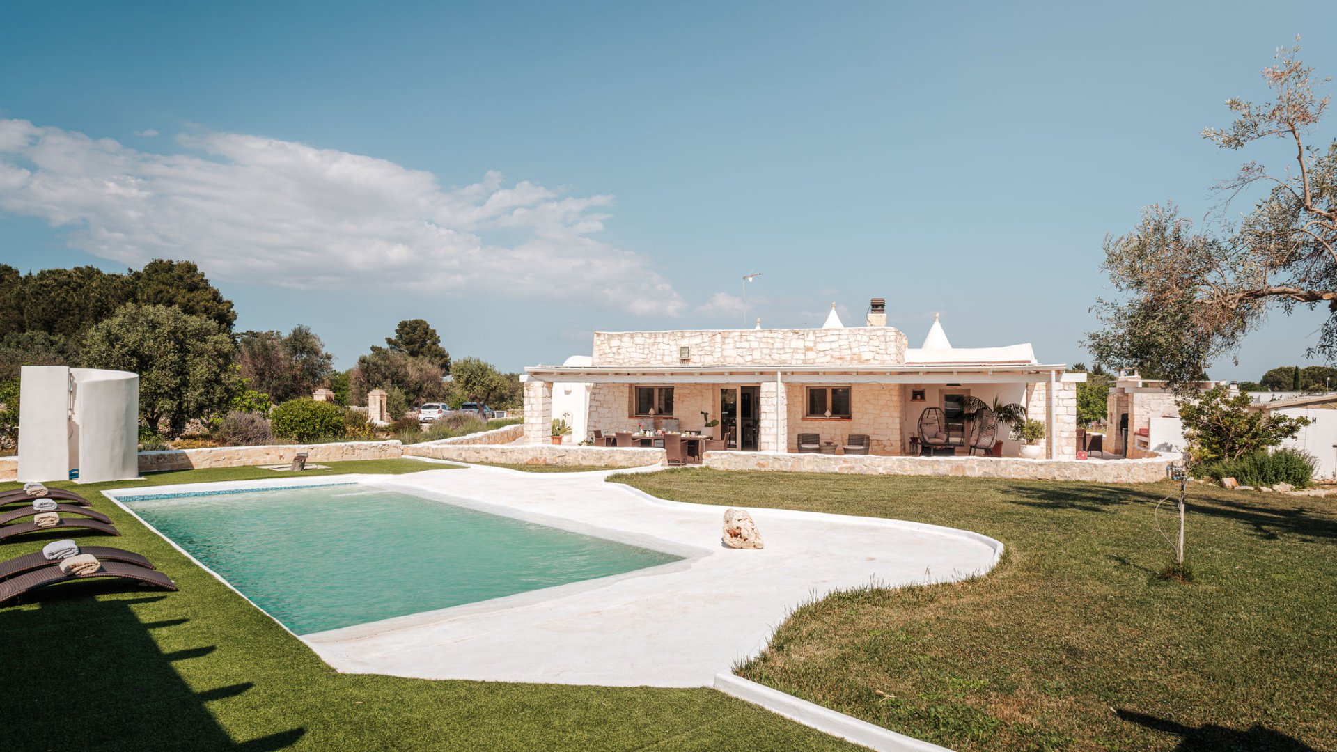 WHITE-STONE-HOUSE ist ein anspruchsvolles und luxuriöses Ferien-Domizil (Trullo) für 7 Personen mit Privat-Pool und Mini-Spa, mit wunderbarem Panorama-Blick auf die sanften Hügel von Apulien - in Nähe von Ostuni und nur 13 km von der Adria-Küste entfernt. Idealer Ausgangspunkt für die Erkundung der Trullo-Region und Ausflüge ans Meer.