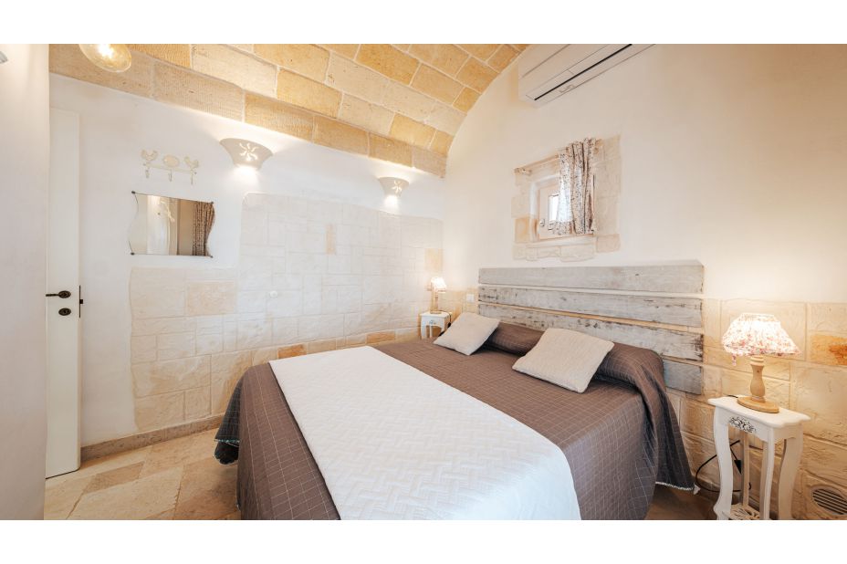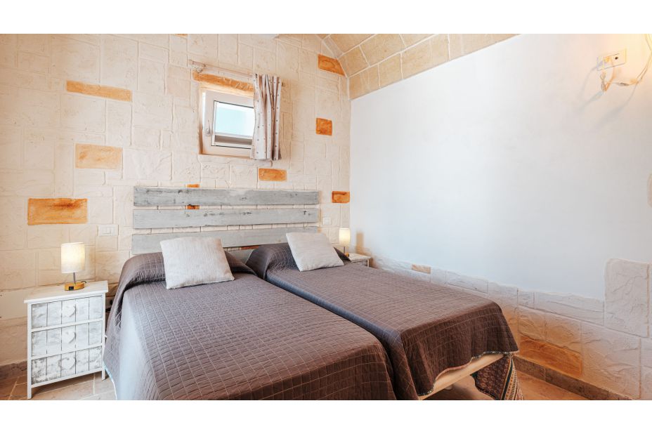 Ein Korridor führt zum Schlafbereich. Das Trullo-Zimmer ist ein Doppelzimmer mit eigenem Bad mit Steinbadewanne und Dusche. Die anderen beiden Schlafzimmer sind ein Doppelzimmer mit eigenem Bad mit Dusche und ein Doppelzimmer mit Einzelbetten immer mit eigenem Bad mit Dusche.