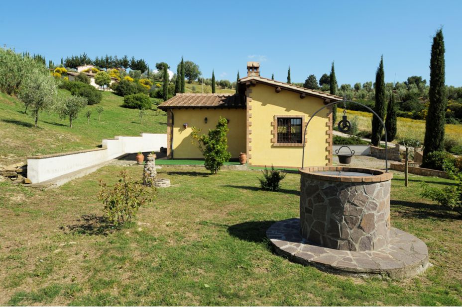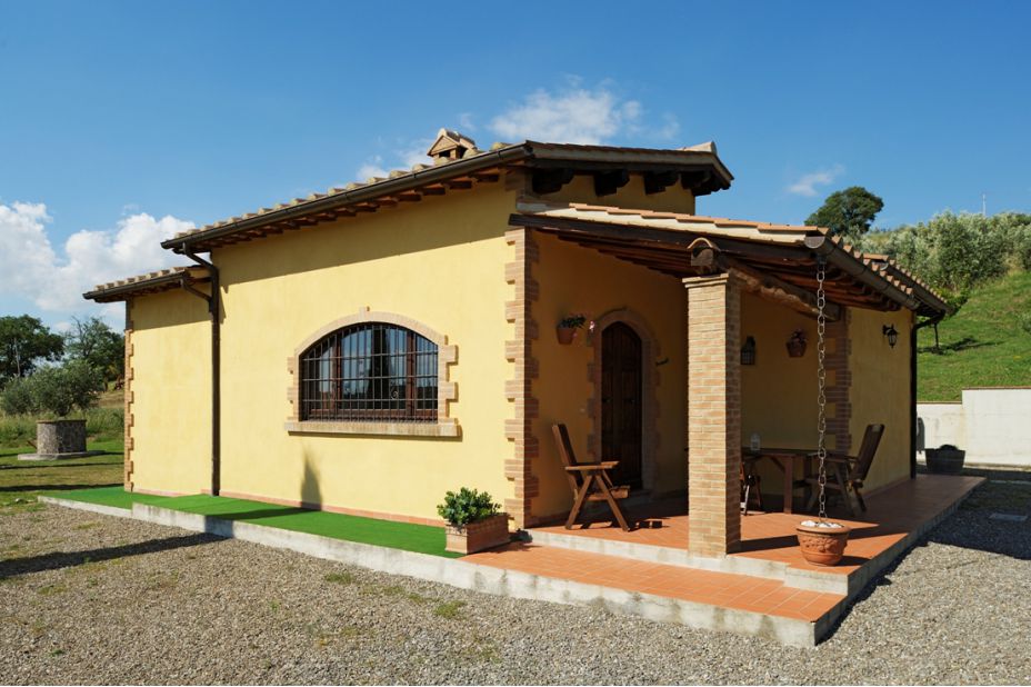 Sitzplatz vor dem Haus mit Sonnenschirm und Grill.